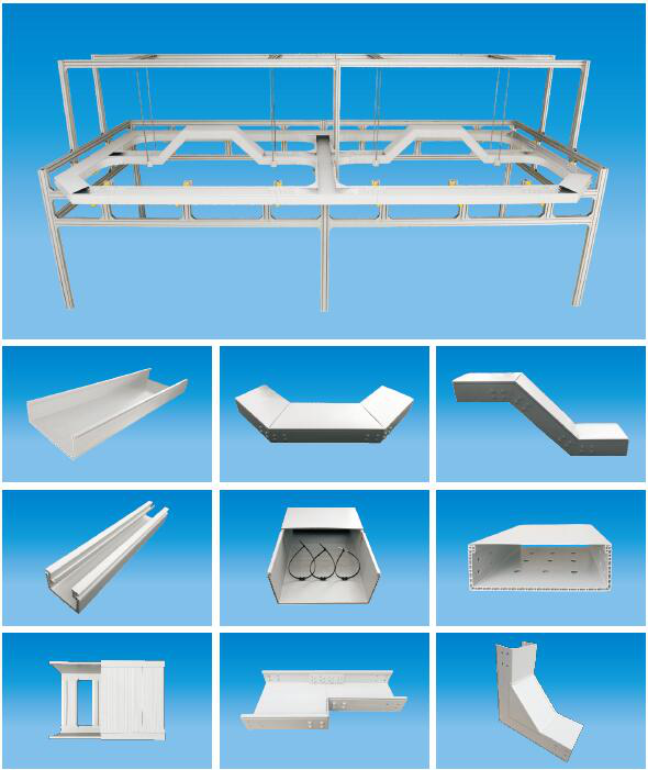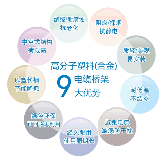 产品材料本身具有绝缘、耐腐蚀、阻燃耐侯性强的特性,而添加不同特性的助剂可得到不同效果的特种产品,其涵盖了传统的热浸镀锌电缆桥架、铝合金电缆桥架、玻璃钢电缆桥架等各种产品。高分子合金电缆桥架集各种常规传统桥架的优势于一身,又可全部回收循环利用